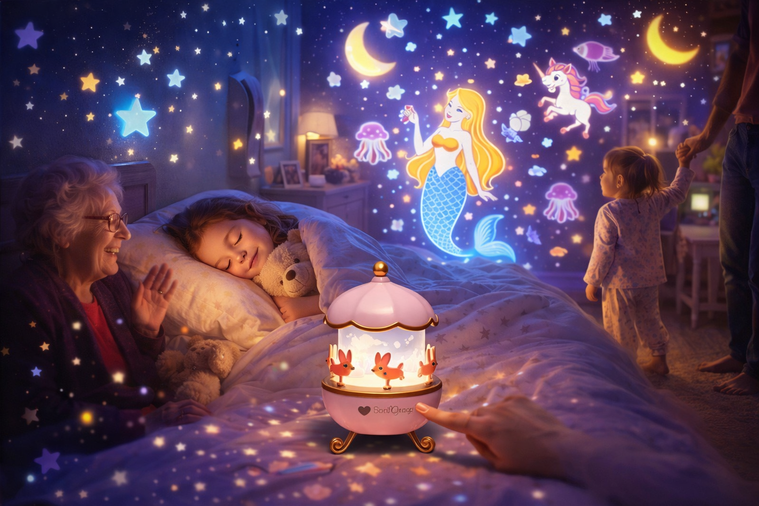 This adorable carousel-style lamp projects gentle patterns and characters around the room, helping kids feel calm, safe, and relaxed as they fall asleep.