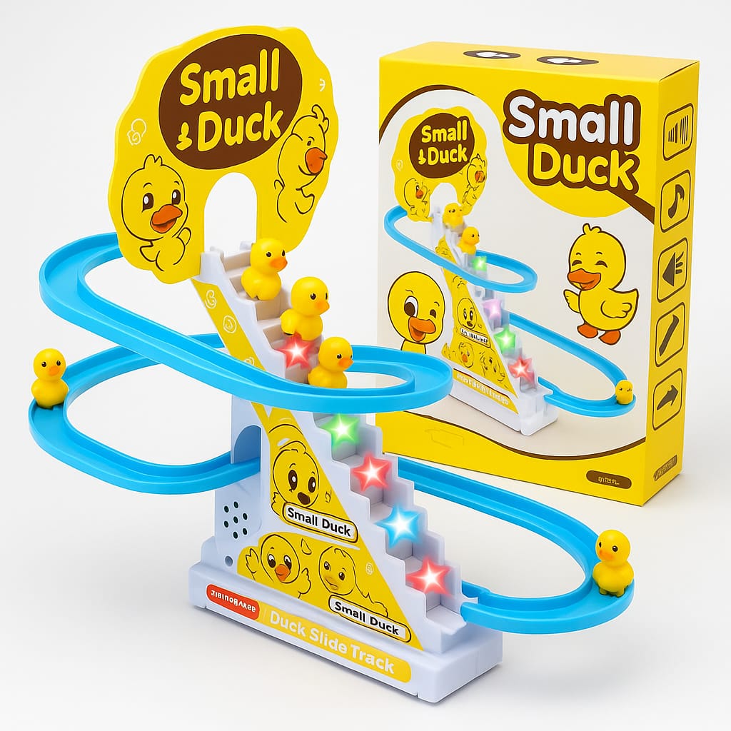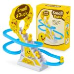 - ⭐ AUTOMATIC LADDER CLIMBING DUCK TOY Cute yellow ducks automatically climb the stairs and slide down the track, keeping kids entertained with non-stop movement.