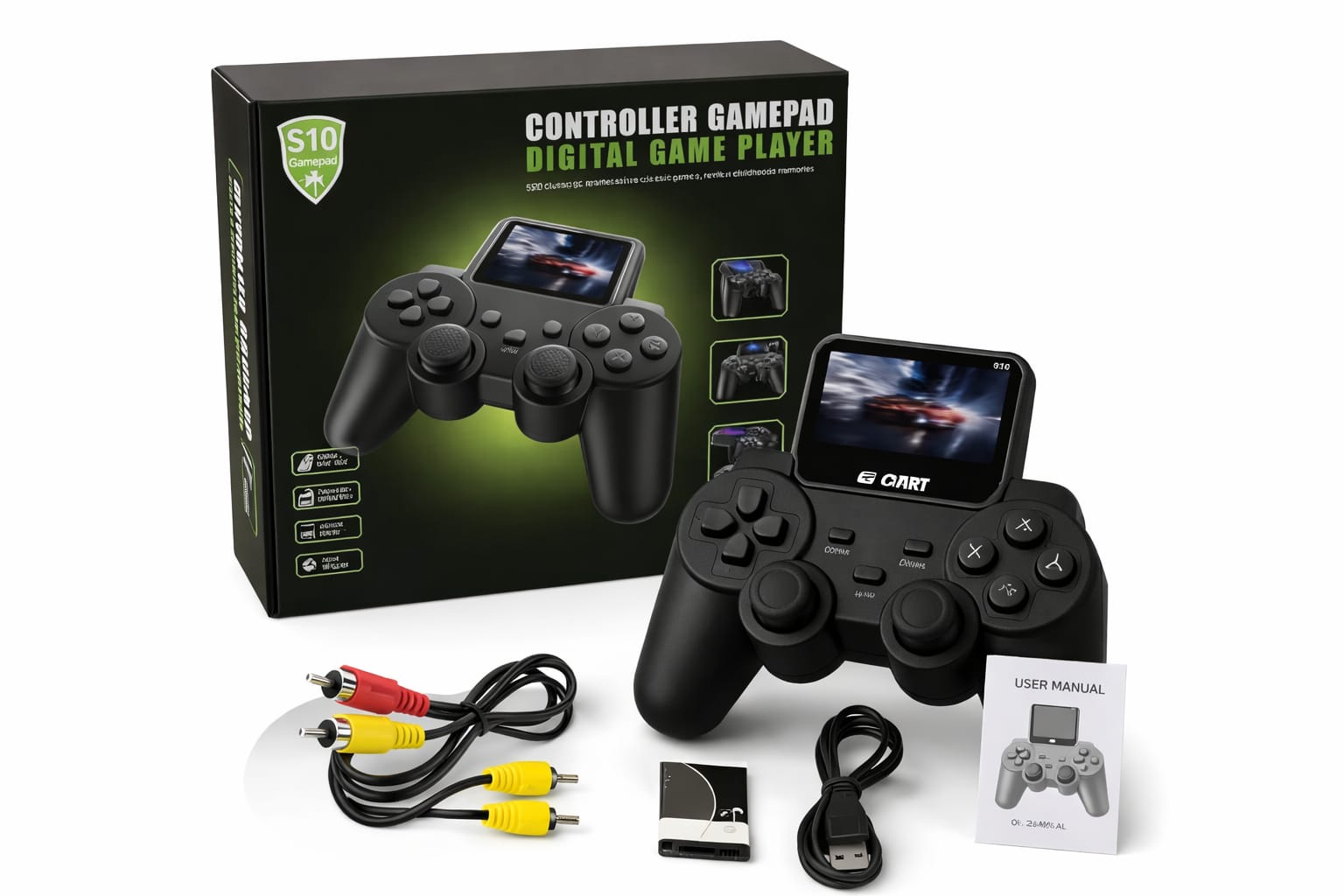 - Complete Gaming Set – Includes controller console, AV cable, USB cable, battery, and user manual.