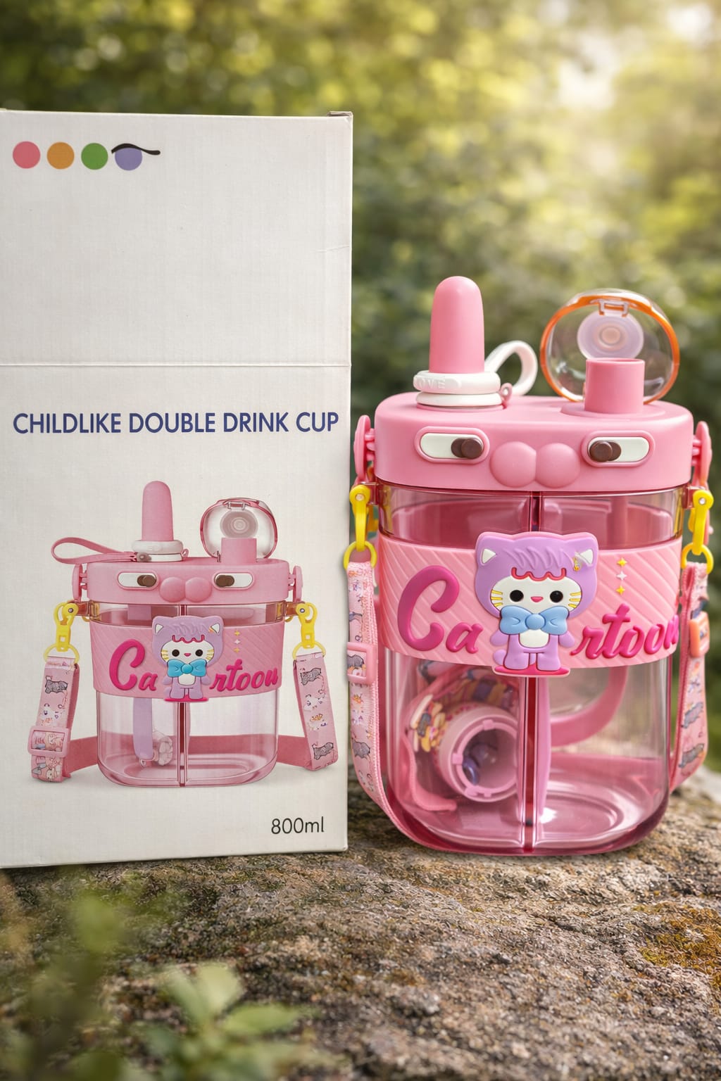 Kids Cartoon Water Bottle with Strap – 800 ml (Purple / Pink)