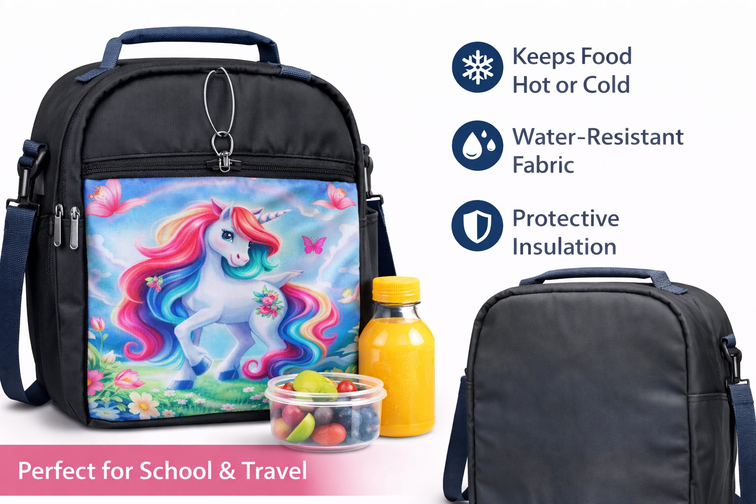 Make mealtime fun with this adorable Unicorn Kids Lunch Bag. Designed with a colorful unicorn cartoon print, this lunch bag is perfect for school-going children. The insulated inner lining helps maintain food temperature for longer periods, keeping meals fresh and tasty. Lightweight yet durable, it comes with a smooth zipper and strong stitching for daily use. Ideal for school, tuition, picnics, and travel.